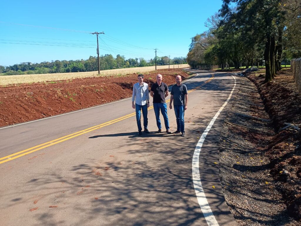 A Prefeitura de Santa Rosa segue avançando com importantes investimentos em infraestrutura no interior do município. O vice-prefeito Aldemir Ulrich e os engenheiros Luís Fernando Cadó Marzari e Maurício Lenz foram conferir a finalização dos serviços na obra de asfalto na Esquina Candeia. A obra teve um investimento de mais de R$ 1 milhão.