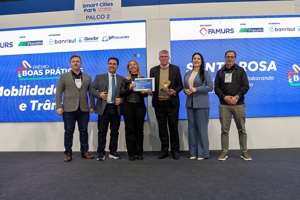 O encontro reuniu gestores municipais de todo o Estado para debater inovação, sustentabilidade e soluções inteligentes para o desenvolvimento das cidades. Durante o evento, foram entregues os Prêmios do Concurso Boas Práticas Municipais, que reconhecem iniciativas inovadoras e eficientes na gestão pública. O município de Santa Rosa ficou entre os três melhores do Rio Grande do Sul na categoria Mobilidade Urbana, “O reconhecimento do nosso Plano de Mobilidade reforça o compromisso da administração com o aprimoramento das políticas públicas voltadas à mobilidade, segurança viária e acessibilidade, promovendo uma cidade mais organizada, moderna, sustentável e preparada para crescer ainda mais”, destacou o Secretário de Mobilidade.