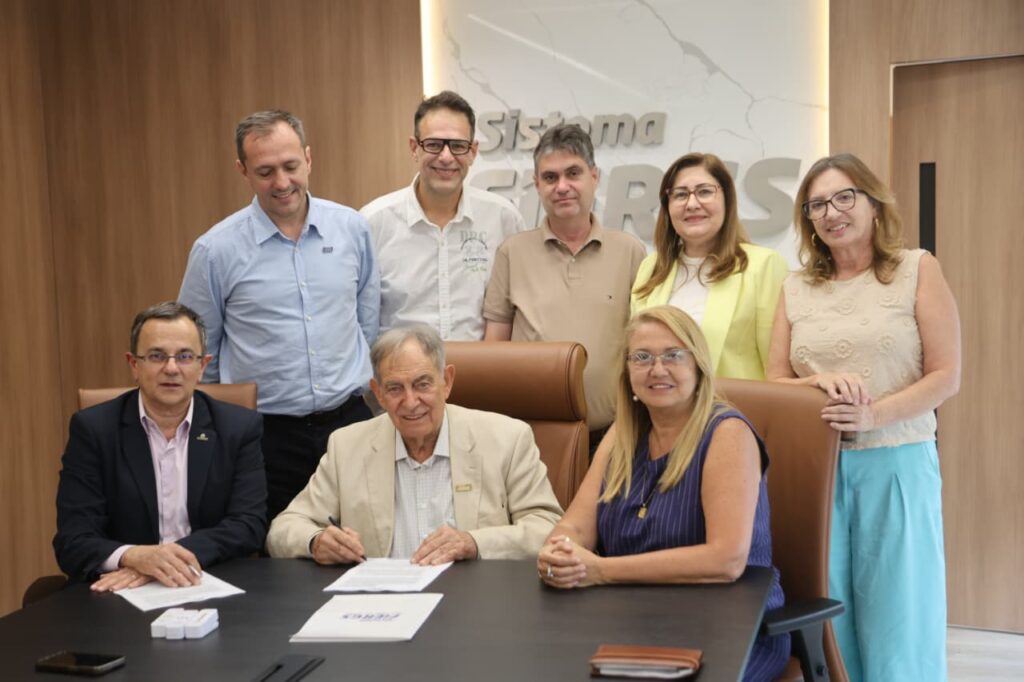 A parceria entre Prefeitura e a Fiergs para a construção de uma nova escola em Santa Rosa acaba de ser firmada. O prefeito Anderson Mantei e a vereadora Lires Zimermann estiveram em Porto Alegre para assinar o Termo de Compromisso. Participaram do ato o Presidente da Fiergs Claudio Bier e Susana Kakuta, Diretora Geral de Sesi-RS, Senai-RS e IEL-RS.