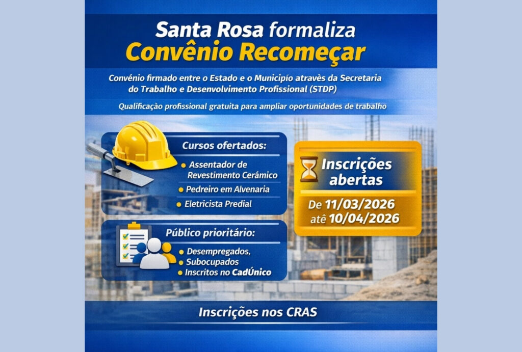 A Prefeitura de Santa Rosa formalizou o Convênio Recomeçar, em parceria com o Governo do Estado, com o objetivo de promover a qualificação profissional gratuita e ampliar a inserção no mercado de trabalho. A iniciativa oferece cursos nas áreas de assentador de revestimento cerâmico, pedreiro de alvenaria e eletricista predial, setores estratégicos para a construção civil e a economia local.