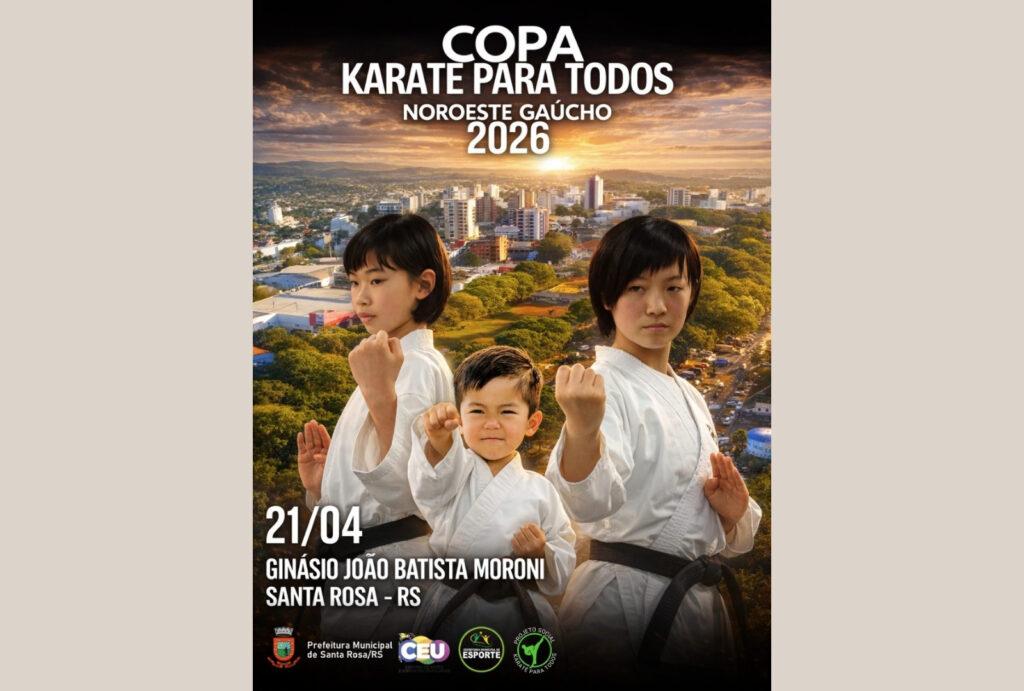 A Prefeitura de Santa Rosa, por meio da Secretaria de Esporte e com o apoio da Federação Gaúcha de Karatê Interestilos, realiza no dia 21 de abril a 5ª edição da Copa Karatê para Todos. O evento irá acontecer no Ginásio João Batista Moroni, com início às 08h. A programação começa com o desfile dos atletas e a entrega de kimonos, seguida pelas competições de kata e kumite, organizadas por graduação de faixa e categoria de idade. A iniciativa busca promover a integração entre os alunos dos diversos núcleos atendidos pelo projeto municipal, oferecendo uma oportunidade prática para que conheçam as regras oficiais de competição.