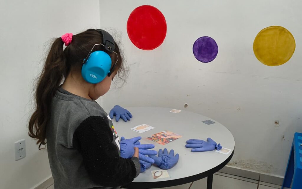 As salas foram divididas para contemplar os sistemas tátil, olfativo, auditivo, visual, proprioceptivo, vestibular e de interocepção. Em um dos espaços, o foco foi a exploração de materiais como massinhas, areia colorida e slimes para estimular o brincar funcional e as associações do cotidiano. A coordenadora do CER II, Cristiane Berres, destacou a ação, “Pessoas no espectro do autismo podem perceber estímulos de forma muito intensa ou reduzida. Por isso, oferecer ambientes estruturados é fundamental para promover o conforto e a regulação desses usuários”.